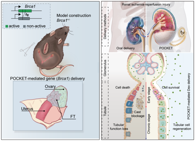 多项动物实验充分验证了该成果的临床适用性与可靠性:在模拟人BRCA1基因突变的卵巢癌预防模型中,该器件成功将功能性基因精准“送达”卵巢表面上皮细胞,既显著降低癌变风险,又同步改善卵巢功能、唤醒生育能力,为携带遗传突变的女性送上“保卵巢、防癌变”的健康福音;在肾脏缺血再灌注损伤模型中,POCKET器件实现抗炎药物的局部长效“缓释补给”,在高效推动肾脏修复的同时,几乎完全规避了传统全身给药带来的严重副作用,为肾脏损伤治疗开辟了新路径。