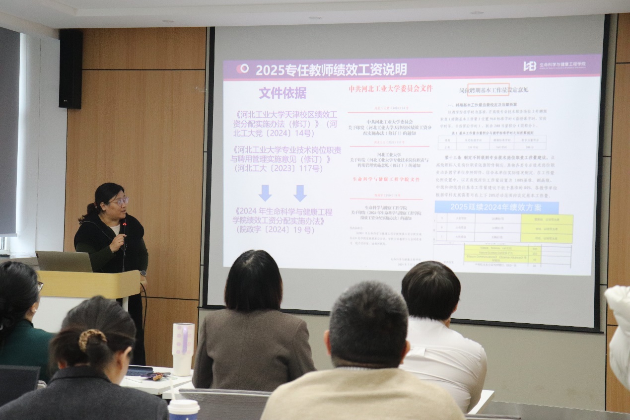 学院办公室主任张晓晨就2025年学院绩效分配情况作了说明,并对校院两级绩效工资政策进行了解读。